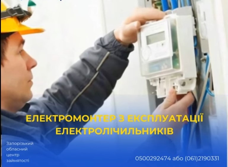 Підприємство запрошує на роботу – електромонтера з експлуатації електролічильників в м. Запоріжжя.